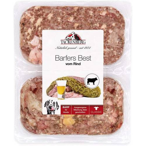 Das Tackenberg Barfers Best vom Rind bietet eine überzeugende Barf-Option für Hunde aller Altersklassen. Besonders ansprechend ist die Kombination aus frischem Rindfleisch, Maulfleisch, grünem Pansen und Rinderlunge, die ein artgerechtes und schmackhaftes Erlebnis verspricht. Uns gefällt die Einfachheit der Zubereitung mit den servierfertigen, tiefgefrorenen Portionen. Ein kleines Manko könnte sein, dass es für manche Hundebesitzer eine Herausforderung sein könnte, zusätzlich geeignetes Gemüse zu integrieren, um eine vollwertige Mahlzeit zu gewährleisten. Die natürliche Zusammensetzung ohne Zusatzstoffe und Konservierungsmittel ist lobenswert. Insgesamt empfehlen wir dieses Produkt als hervorragende Wahl für Barf-Einsteiger und erfahrene Barfer gleichermaßen.