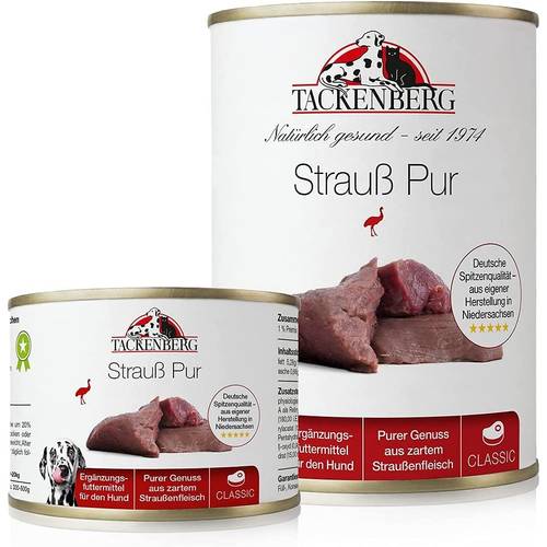 Das Tackenberg Strauß Pur Nassfutter für Hunde wird getreidefrei in einer Dose geliefert. Der Fett- und Feuchtigkeitsgehalt des Fleisches schneiden gut in unserem Vergleich ab. Es eignet sich gut für allergische Hunde oder übergewichtige Vierbeiner.