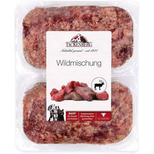 Einer der Gründe, warum das Tackenberg Barf Wildmischung für Hunde im Vergleich der Hundefutter auf einem der besseren Ränge landet, ist die Tatsache, dass es auch für allergische Hunde gut geeignet ist. Der sehr hohe Proteingehalt überzeugt ebenso wie die einzeln verpackten Portionen mit 250 g.