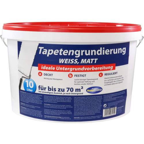 Wie wir bei toom lesen, soll dieser toom-Tapetengrund, (weiß), gleich drei Aufgaben erledigen: Decken, Festigen und Regulieren des Untergrunds.