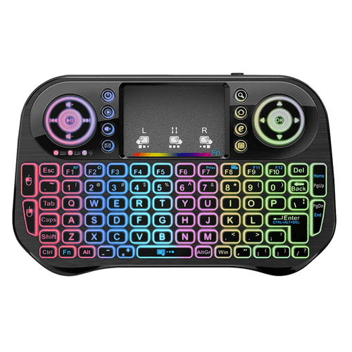 | Die Wireless-Mini-Touch-Tastatur ist eine kabellose Tastatur, die mehr einem Controller oder einer Fernbedienung ähnelt. Sie wird über Batterien oder einen integrierten (wiederaufladbaren) Akku betrieben. Kategorien: