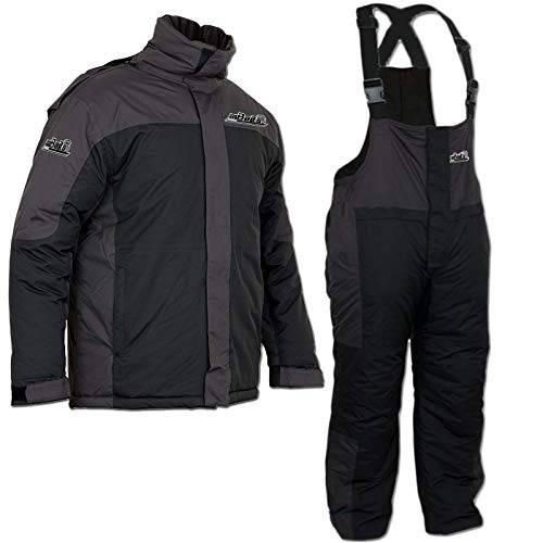 Thermoanzüge zum Angeln bestehen typischerweise aus einer Jacke und einer Hose. Meist handelt es sich bei der Hose des 2-teiligen Thermoanzugs um eine Latzhose mit verstellbaren Hosenträgern.