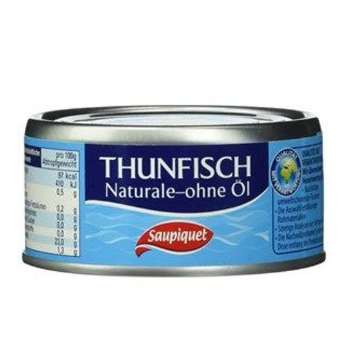 Auf diesem Foto wird uns Saupiquet-Thunfisch in Wasser (ohne Öl) in einer 80-g-Dose gezeigt.