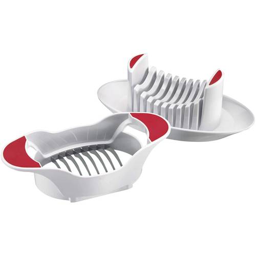 Ein Tomatenschneider schneidet Gemüse und anderweitige Zutaten in gleichmäßige Stücke. Die meisten Modelle schneiden Tomaten, Mozzarella und mehr in Scheiben. Jedoch sind auch Mozzarellaschneider erhältlich, welche das Gemüse in Hälften spalten.