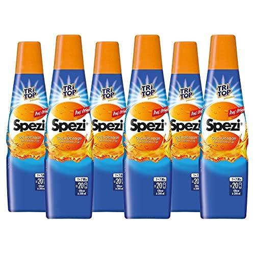 Der Tri-Top-Spezi-Cola-Orange-Getränkesirup wird mit viel Frucht und feiner Mandarinen-Note sowie Orangenöl angeboten. Die Flaschenergiebigkeit reicht für 20 Portionen, was uns gut gefällt. Auch im Rahmen einer veganen Ernährung wäre das Produkt geeignet. Im praktischen Vorratspack sind sechs Flaschen zu je 600 ml enthalten.