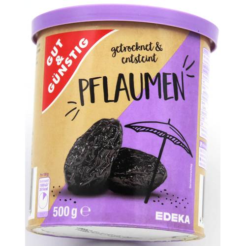 Die getrockneten und entsteinten Pflaumen von Gut & Günstig kommen in einer runden Verpackung.
