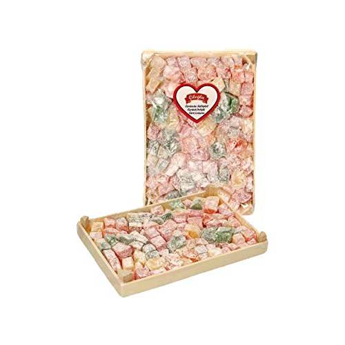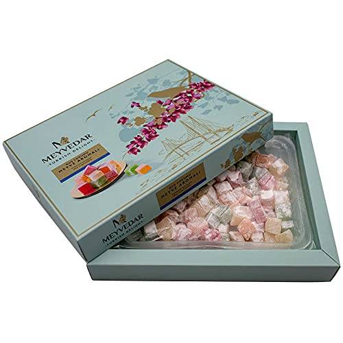 Diese türkischen Süßigkeiten von Sebahat in der Mixed-Box enthalten verschiedene Lokum-Sorten mit Fruchtaromen. Die dekorative Verpackung, die wir hier sehen, eignet sich gut als Geschenk.