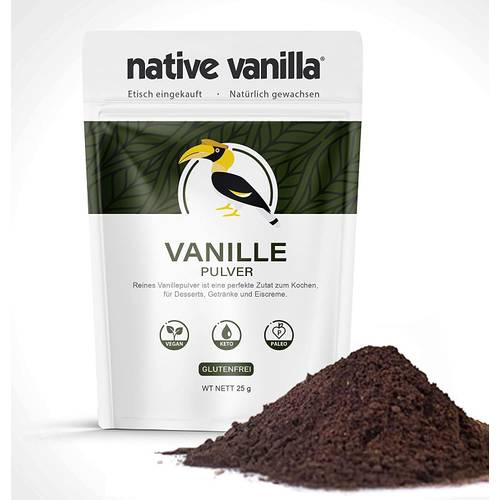Native Vanilla bietet Vanillepulver im unteren Preissegment an, das sich vielseitig beim Kochen, Backen, für Desserts und zur Verfeinerung einsetzen lässt. Leider handelt es sich nicht um ein nachhaltiges Produkt. Dennoch könnte es für die Zubereitung von Vanillezucker eine geeignete Option sein.