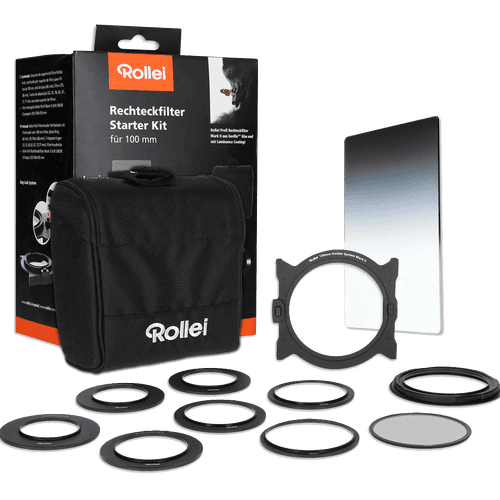 Das Rollei Starter Set Mark II mit verschiedenen Adapterringen.