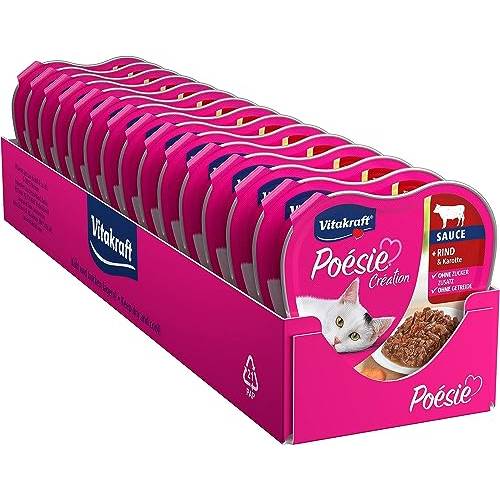 Katzen bevorzugen fleischhaltiges Futter mit vielen Proteinen. Daher ist das Vitakraft-Poésie-Katzenfutter laut diversen Vitakraft-Katzenfutter-Tests im Internet eine sehr beliebte Wahl.