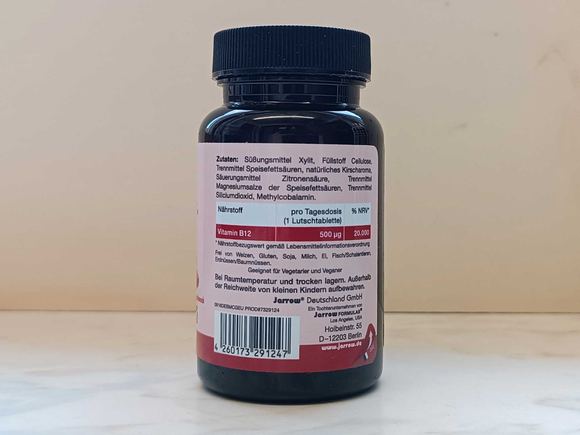 Bei den Jarrow-Methyl-Vitamin-B12-Tabletten handelt es sich um Lutschtabeltten mit Kirschgeschmack, wie wir feststellen.
