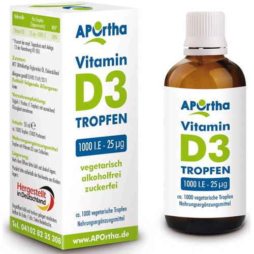 Platz 3 | Aportha Vegan Vitamin D3 Tropfen | ca. 10 € | 1 Tropfen pro Tag ca. 0,01 € | 1.000 IE | ||
