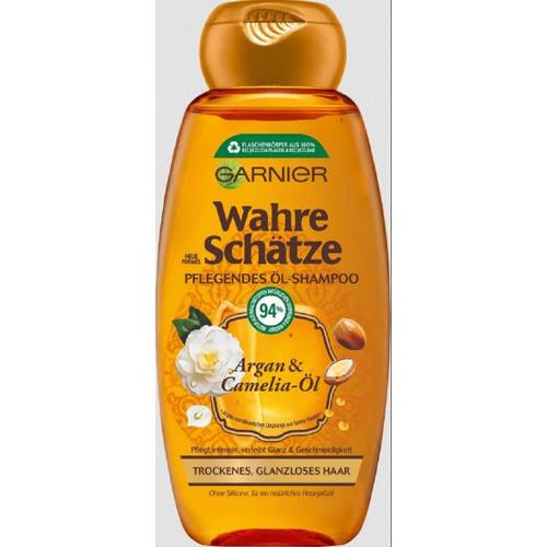 Die 250-ml-Flasche des Wahre-Schätze-Shampoos besteht zu 100 % aus recyceltem Kunststoff, wie wir herausfinden und ist Teil des Garnier-Nachhaltigkeitsversprechens.