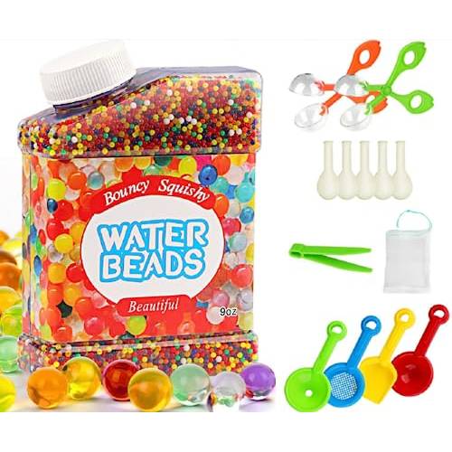 In den meisten Packungen ist eine Mischung aus bunten Wasserperlen enthalten, es gibt sie aber auch in Einzelfarben. Wenn Sie mit Ihren Kindern beispielsweise einen Ozean nachgestalten wollen, lässt sich das mit blauen Wasserperlen schön umsetzen. Kleine Seepferdchen, Fische und Seesterne aus Kunststoff lassen den Perlen-Ozean lebendig werden.