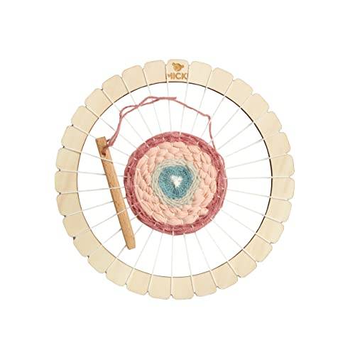 Neben der runden Variante, die uns hier gezeigt wird, gibt es den Rico-Design-Webrahmen auch in eckigen und ovalen Formen, ideal für geometrische Muster oder Wanddekorationen im modernen Stil.