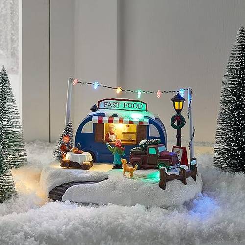 Modell | Feeric Lights & Christmas Weihnachtsdorf mit Zug | Lights4fun LED Imbissstand | Eminza Fee-138307 | Lemax 45473 | Lemax Lucys Chocolate Shop | Lemax 05618 | infactory Weihnachtsdorf | Spetebo 54199 |