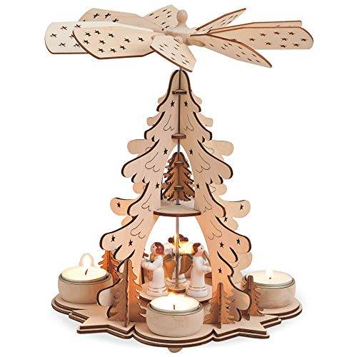 Auch die Leichtgängigkeit des Rotors, also der Drehmechanismus, spielt eine große Rolle, wie diverse Weihnachtspyramiden-Tests im Internet beweisen. Nur wenn die Flügel der Weihnachtspyramide optimal ausgerichtet und gut ausbalanciert sind, kann sich die Pyramide gleichmäßig und störungsfrei drehen. Besonders bei einer Weihnachtspyramide mit Kerzen sollte das Zusammenspiel zwischen Wärmeentwicklung, Luftstrom und Achsenlagerung exakt abgestimmt sein.