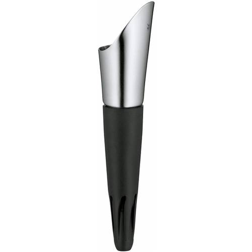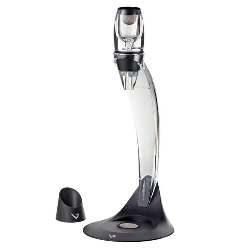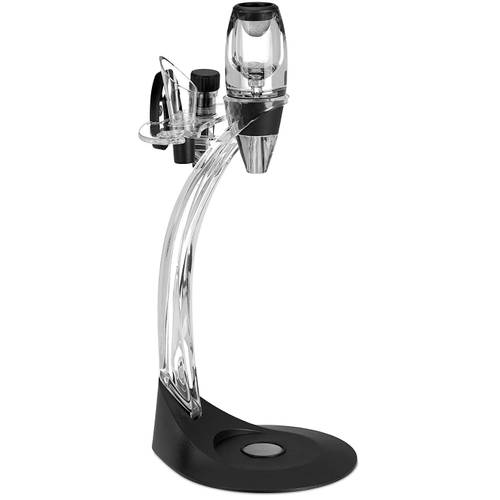 Klassische Dekantierungsausgießer werden mit einer Hand über dem Glas festgehalten, während mit der anderen der Wein aus der Flasche durch diesen gegossen wird. Eine bequeme Anwendung mit einer Hand ermöglichen spezielle Halterungen.