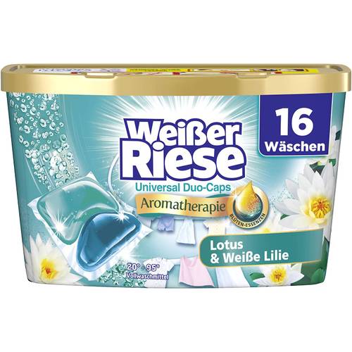 Dieses Weißer-Riese-Waschmittel „Good Mood Lotus“ das uns hier gezeigt wird, ist eines von zwei Aromatherapie-Waschmitteln der Marke.