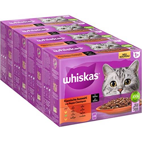 Platz 3 | Whiskas Klassische Auswahl (Huhn, Rind, Pute, Lamm) in Sauce 1+ | ca. 30 € | erwachsene Katzen 1+ alle Rassen | Huhn, Rind, Pute, Lamm
