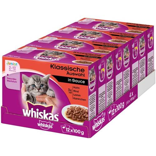 Platz 2 | Whiskas Junior case443680 | ca. 19 € | Kitten alle Rassen | Rind, Huhn, Lamm, Geflügel in Sauce | ![]() ![]() | |