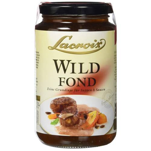 Dieser Escoffier-Wildfond ist eine konzentrierte Fleischbrühe aus Wasser, Wildknochen, Hirschfleisch, Rinderknochen, Rindfleisch, Rinderfleischextrakt, Zwiebeln, Karotten, Petersilie, Wacholderbeeren, schwarzer Pfeffer, Nelken, Salbei, Lorbeerblätter, Rosmarin, Thymian, Tomate, und Sellerie, verfeinert mit Portwein, Madeirawein, Speisesalz und Rohrzucker.