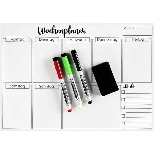 Wochenplaner als Whiteboard sind in der Regel mit Whiteboard-Markern und einem Schwamm ausgestattet, sodass Sie diese Materialen nicht zusätzlich erwerben müssen. Das Praktische an Whiteboard-Planern ist, dass sie wiederverwendbar sind.