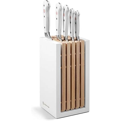 Damit der Messerblock auch gut zu Ihrer restlichen Kücheneinrichtung passt, ist auch das Design von Bedeutung. Sowohl schwarze Wüsthof-Messerblöcke stehen Ihnen zur Auswahl als auch hellere Modelle in einer weißen Farbe. Des Weiteren bietet die Marke auch Messerblöcke in einer Holzoptik an.