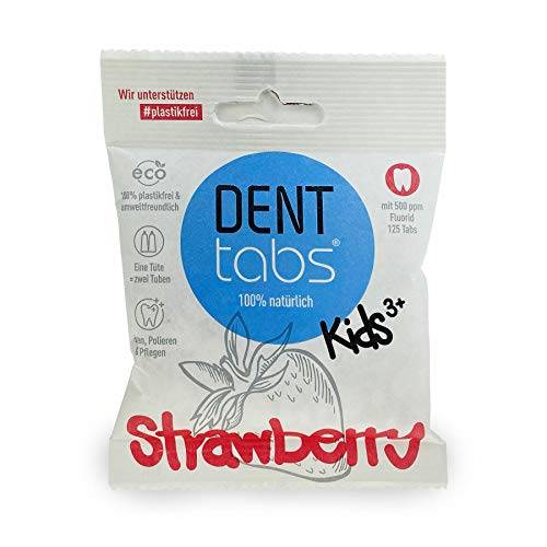 Wie wir erfahren, gibt es diese denttabs-Zahnputztabletten nicht nur mit Mintgeschmack, wie hier, sondern auch mit Erdbeergeschmack und beide Sorten, mit und ohne Fluorid.