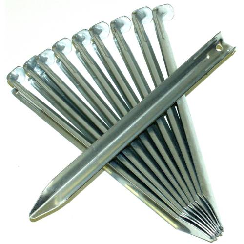 | Aluminium | Aluminium wird besonders häufig bei der Herstellung von Zelt-Heringen verwendet. Das liegt daran, dass das Material leicht und darüber hinaus besonders stabil ist. Grundsätzlich ist Aluminium nicht so stabil wie Stahl. Deshalb sollte man beim Einschlagen des Herings in härtere Böden aufpassen, um den Hering nicht durch zu viel Gewalt kaputt zu machen. Wenn Sie auf einen Stein treffen, sollten Sie die Abspannleinen Ihres Campingzeltes lieber verlängern und die Zeltheringe aus Alu an einer anderen Stelle in den Boden schlagen. | |