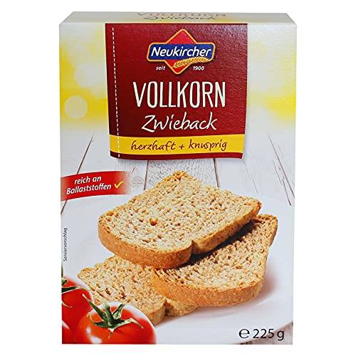 Der Neukircher-Vollkorn-Zwieback, den wir hier sehen, wird aus Weizenvollkornmehl hergestellt und ist eine ballaststoffreiche Alternative zu herkömmlichem Zwieback.