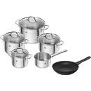 Wie bereits richtig angemerkt, enthalten die 5-teiligen Sets oft nur vier Deckel. Das liegt daran, dass der Deckel des Stieltopfes auch auf den kleinen Kochtopf passt.